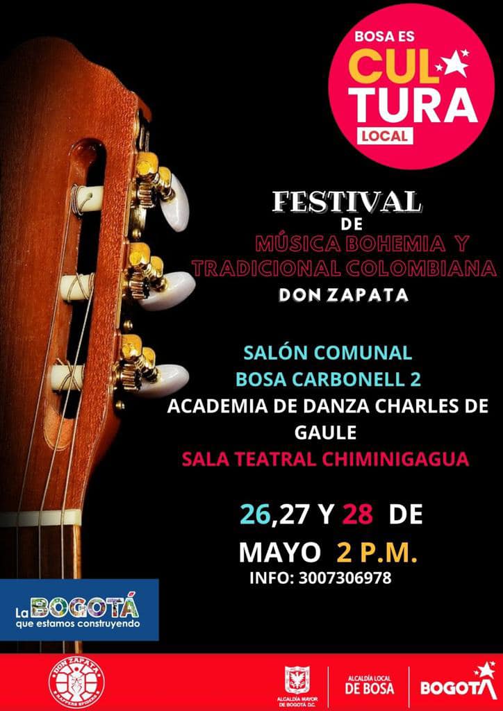 Desde el 26 y hasta el 28 de mayo se realizará el Festival de Música Bohemia y Tradicional colombiana Don Zapata, un encuentro con los ritmos musicales tradicionales de Colombia y que se llevará a cabo en diferentes escenarios de la localidad.