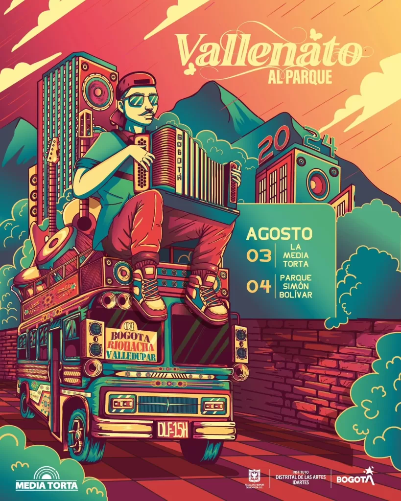 El 3 y 4 de agosto en la Media Torta y en el Parque Simón Bolívar, respectivamente, se podrá disfrutar de la primera edición del Festival Vallenato al parque, que se une a la gran agenda cultural de la ciudad de Festivales al Parque, con el propósito de rendir homenaje a ese género y su aporte cultural, de apoyar su preservación y de ofrecer a la ciudadanía la posibilidad de disfrutar de la música desde la garantía de la diversidad de formas de ser y de estar en Bogotá.