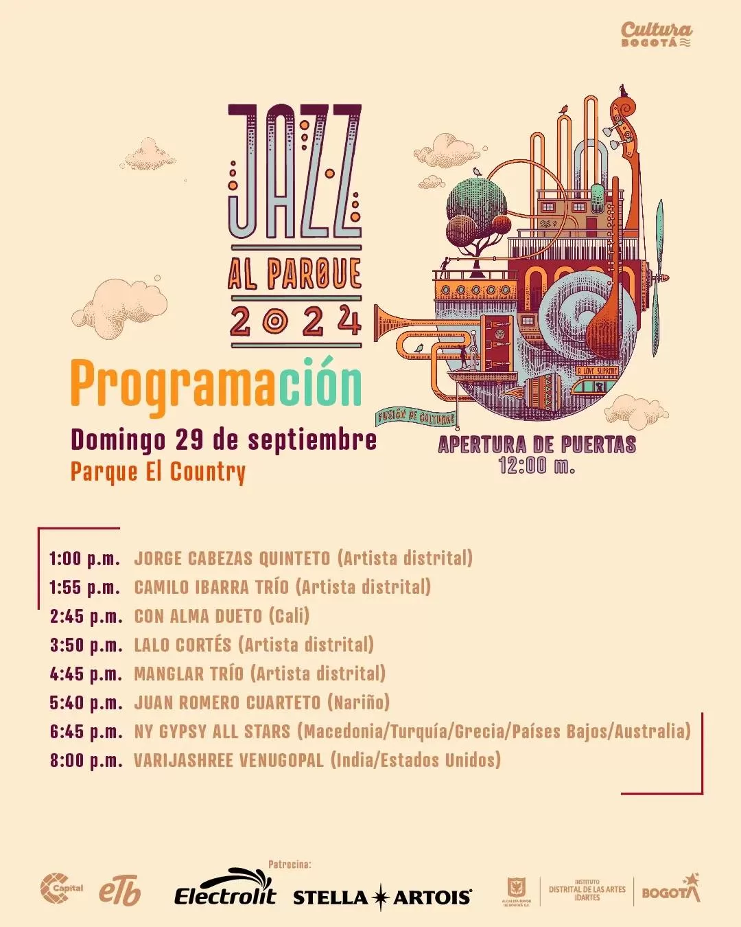 Este próximo 28 y 29 de septiembre llega al Parque El Country la versión 27 de Jazz al Parque, que para este año trae a escena cuatro artistas internacionales de India, Grecia, Turquía y Estados Unidos, tres nacionales de Medellín, Popayán y Cali, y ocho de Bogotá, quienes enriquecerán la propuesta musical del festival mediante la mezcla de sonidos de varias partes del mundo.