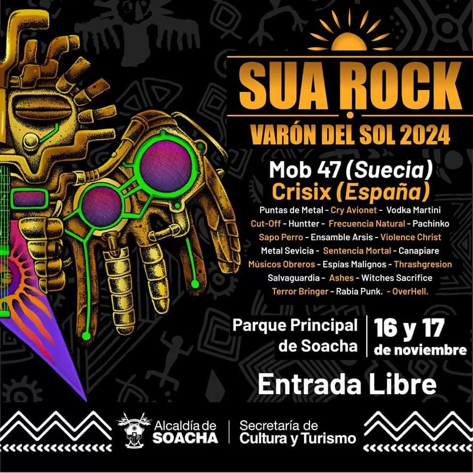La cita será este 16 y 17 de noviembre, desde las 12:00 m., en el Parque Principal de Soacha, y tendrá como invitados especiales a las bandas internacionales Crisix y Mob 47. El Sua Rock 2024 cuenta además con un espacio para el emprendimiento local, y busca visibilizar el talento emergente de la región mientras fomenta la cultura rockera en un escenario que respira diversidad musical.